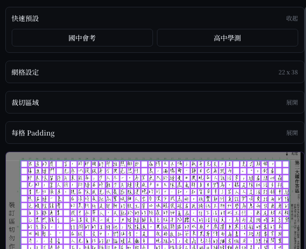 預設支援國中會考與高中國寫作文紙格式,自動對齊網格,精準擷取每一個字元。